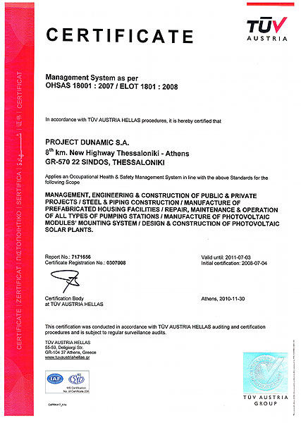Therefore, the Company’s staff is in the continuous pursuit of achieving the best results. In this context, the company applies a Health and Safety management system according to ELOT 1801:2008/ OHSAS 18001:2007 standards, as well as a Quality control system, in line with ISO 9001:2008 system standards for the projects’ control throughout all their phases.