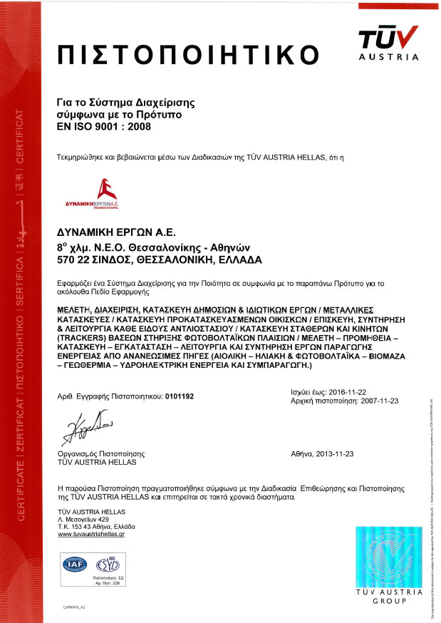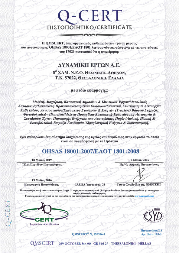 Πάγια πολιτική της Δυναμικής Έργων Α.Ε. είναι η ποιοτική κατασκευή των έργων της. Στα πλαίσια αυτά η εταιρία εφαρμόζει το σύστημα Διαχείρισης Ποιότητας με βάση τα πρότυπα EN ISO 9001, EN 1090 για τις μεταλλικές κατασκευές, EN ISO 3834-2 για τις συγκολλήσεις σε όλες τις φάσεις των εργασιών της, καθώς επίσης και σύστημα Διαχείρισης Υγείας και Ασφάλειας στην Εργασία σύμφωνα με το πρότυπο OHSAS 18001.