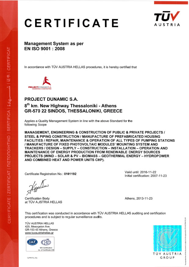 Therefore, the Company’s staff is in the continuous pursuit of achieving the best results. In this context, the company applies a Health and Safety management system according to ELOT 1801:2008/ OHSAS 18001:2007 standards, as well as a Quality control system, in line with ISO 9001:2008 system standards for the projects’ control throughout all their phases.